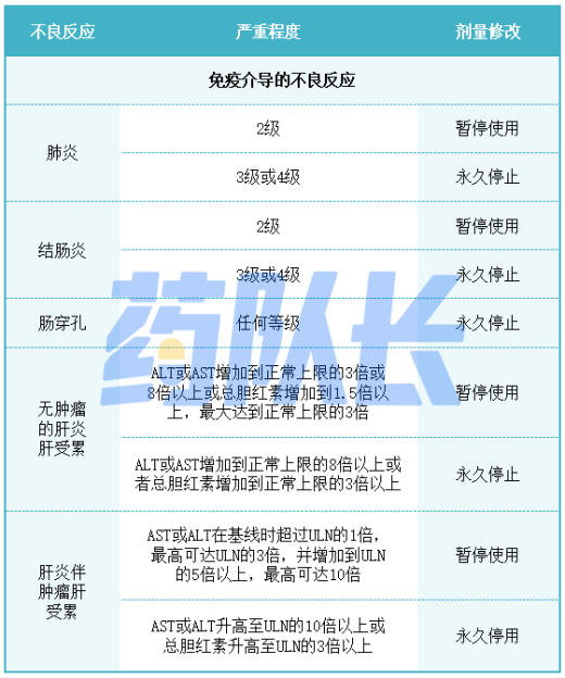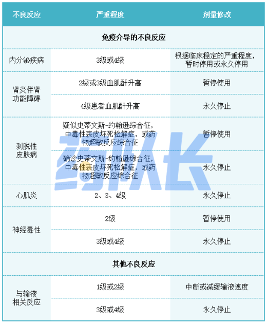 一般不建议减少治疗剂量。对于严重的(3级)免疫介导的不良反应,建议保留治疗方案。对于危及生命的(4级)免疫介导的不良反应,需要全身免疫抑制治疗的复发性严重(3级)免疫介导的反应,或在开始使用皮质类固醇12周内无法将皮质类固醇剂量减少到每天10mg或更少的泼尼松或等量物,永久停止治疗方案。