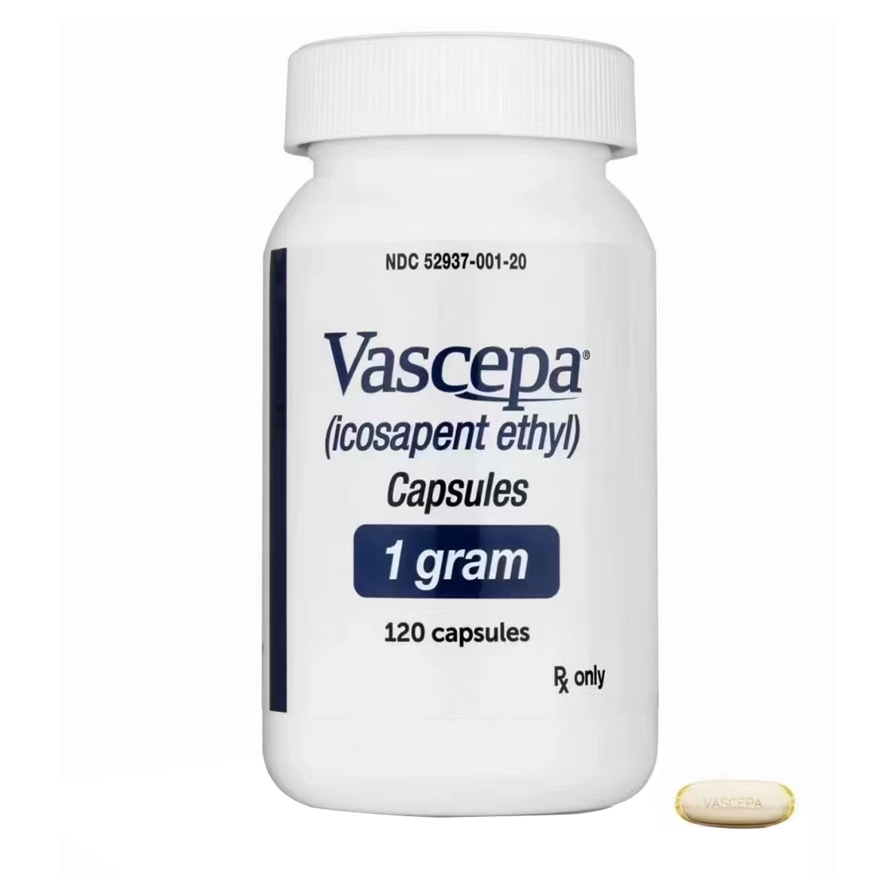 为液体制剂的软明胶胶囊,呈琥珀色。1克为长椭圆形,印有“VASCEPA”字样。