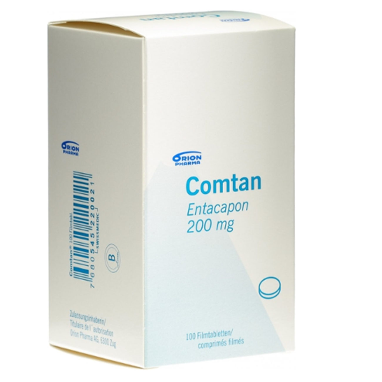 棕橙色椭圆形薄膜包衣片,一面刻有“Comtan”字样。